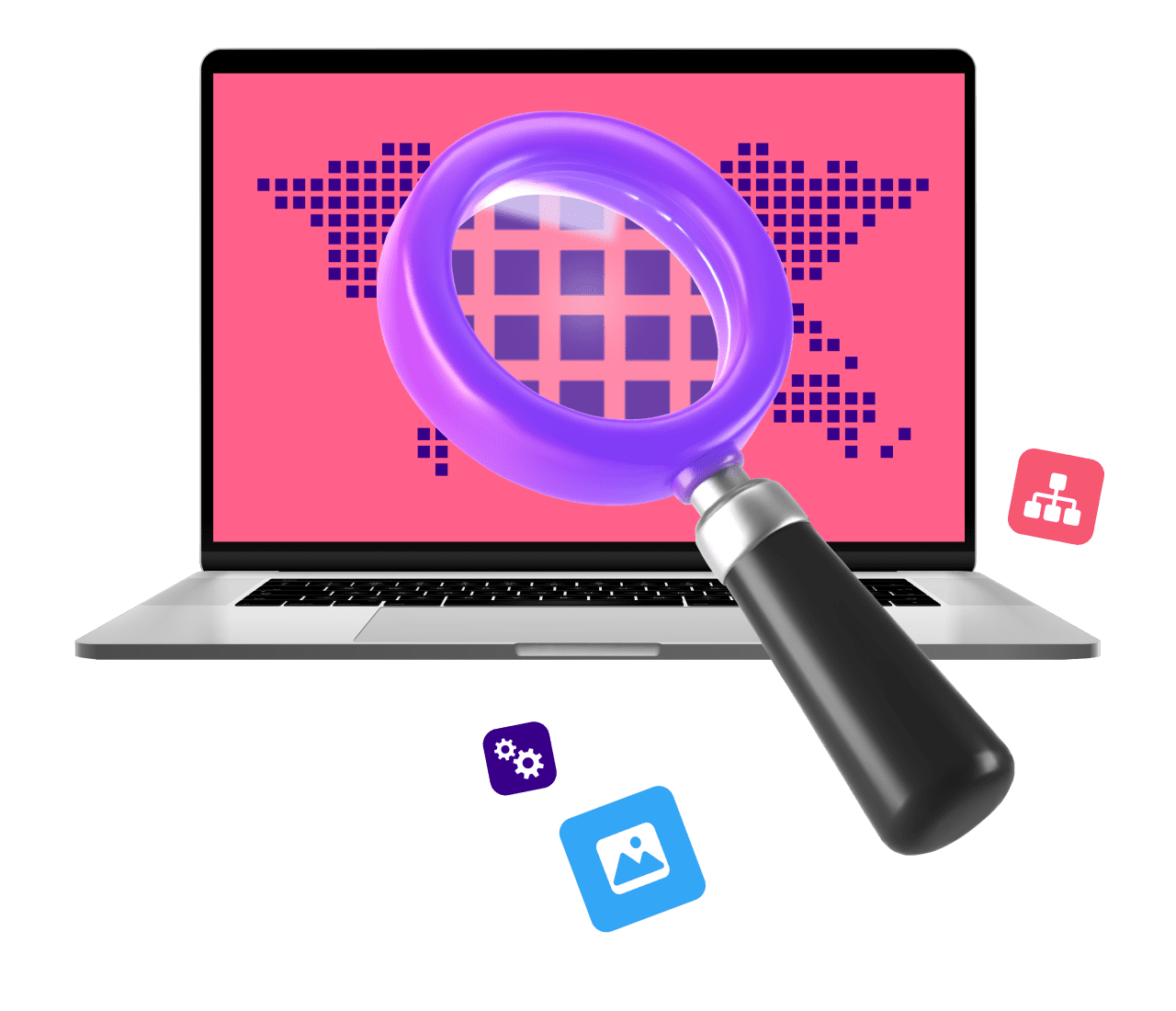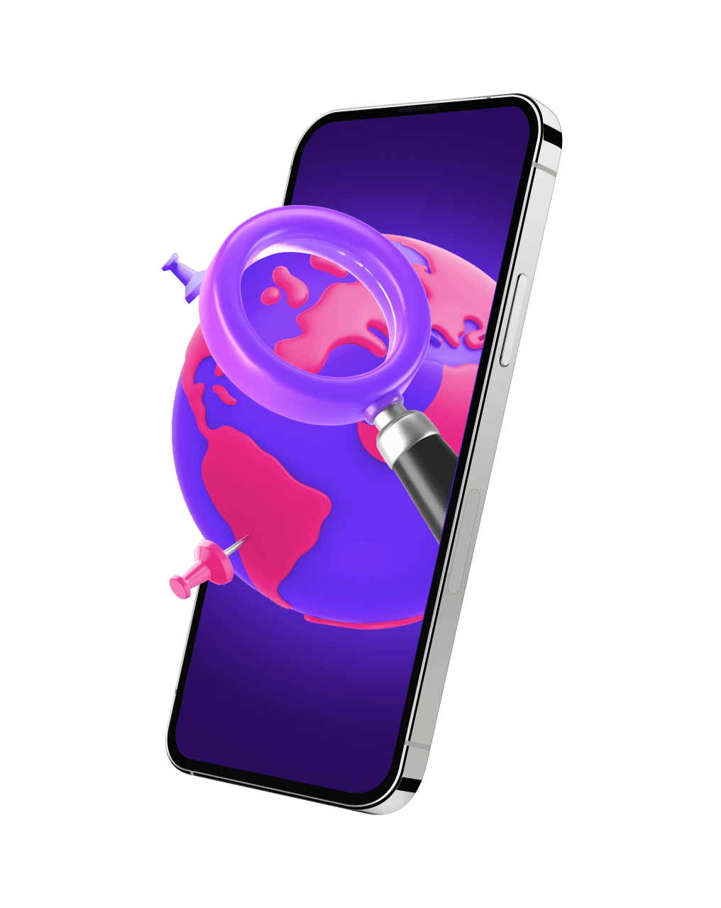 A mobile phone with a pink and purple earth globe and a magnifying glass emerging from the screen
