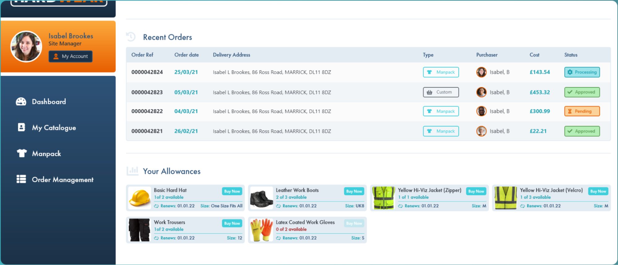 Going beyond great features like pre-populated wearer sizes, our custom order portals allows you to make your buyers’ portal ‘their’ portal. Give it a familiar touch, branded with their company colours and logo, so the experience of using your website is truly unique to their employees.